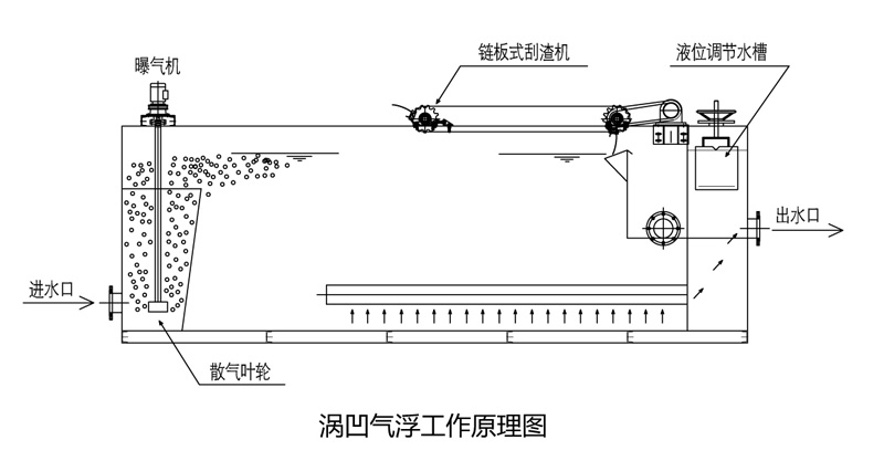 由于气水混合物和液体之间密度的不平衡,产生了一个垂直向上的浮力,将SS带到水面。上浮过程中,微气泡会附着到SS上,到达水面后SS便依靠这些气泡支撑和维持在水面。浮在水面上的SS间断地被链条刮泥机清除。刮泥机沿着整个液面运动, SS从气浮槽的进口端流到出口端的污泥排放管道中。净化后的污水流入溢流槽再自流至生化处理部分。
